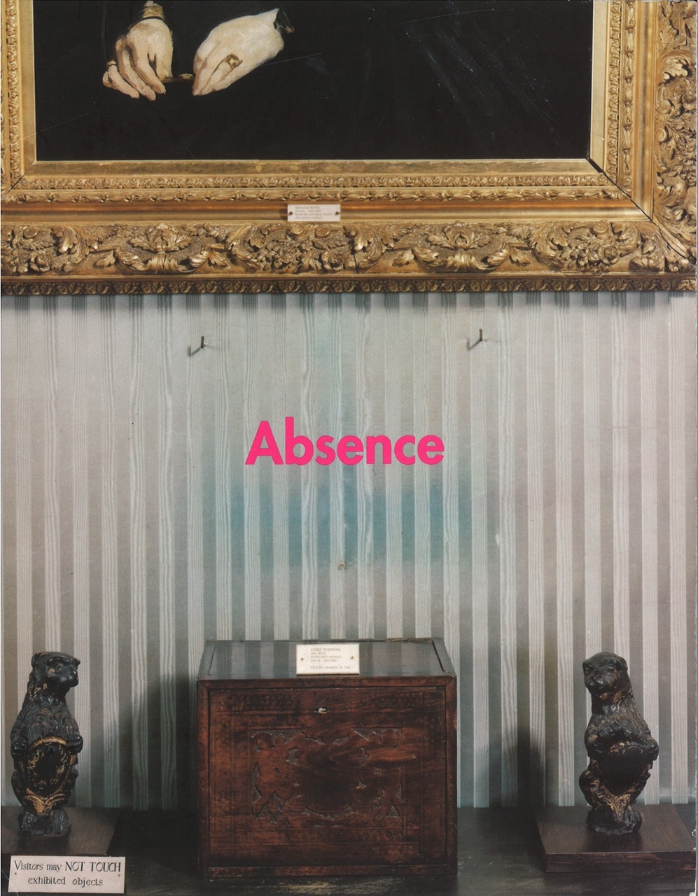 La couverture du catalogue s’illustre ainsi de l’une des photographies de cette série en référence à une toile disparue de Manet Chez Tortoni. Cette photographie était présentée accompagnée d’un texte encadré avec les descriptifs des différentes personnes sollicités par l’artiste pour commenter le tableau absent. Ici sur la couverture, le cartel et les crochets de fixation sont les seuls témoins de l’œuvre disparue, mais cette fois-ci, le titre du catalogue, Absence, qui n’existe pas sur la photographie originale, ajoute une dimension supplémentaire à la symbolique de l’œuvre et du livre.