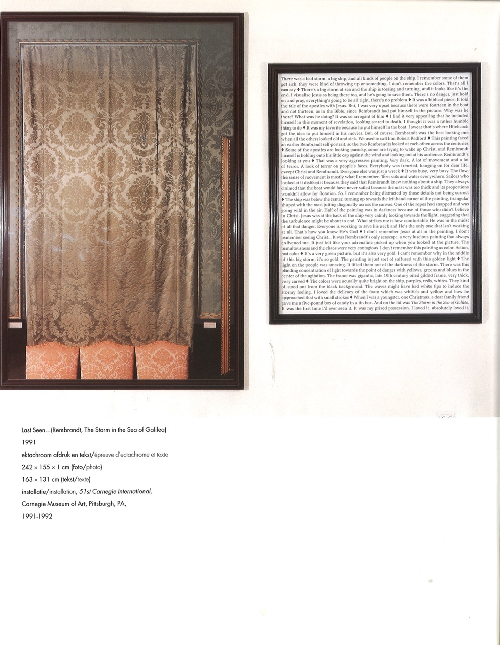 C’est dans cette même perspective que Sophie Calle propose pour le Museum Boymans-van Beuningen d’introduire au milieu des collections d’objets, des éléments divers, qui lui appartiennent et occupent une place sentimentale dans son « musée » personnel. Pour le Musée cantonal des Beaux-Arts à Lausanne elle demande aux permanents du Musée de lui décrire leur souvenir de la partie manquante d’un tableau partiellement détruit par le feu à la suite d’un acte de vandalisme.