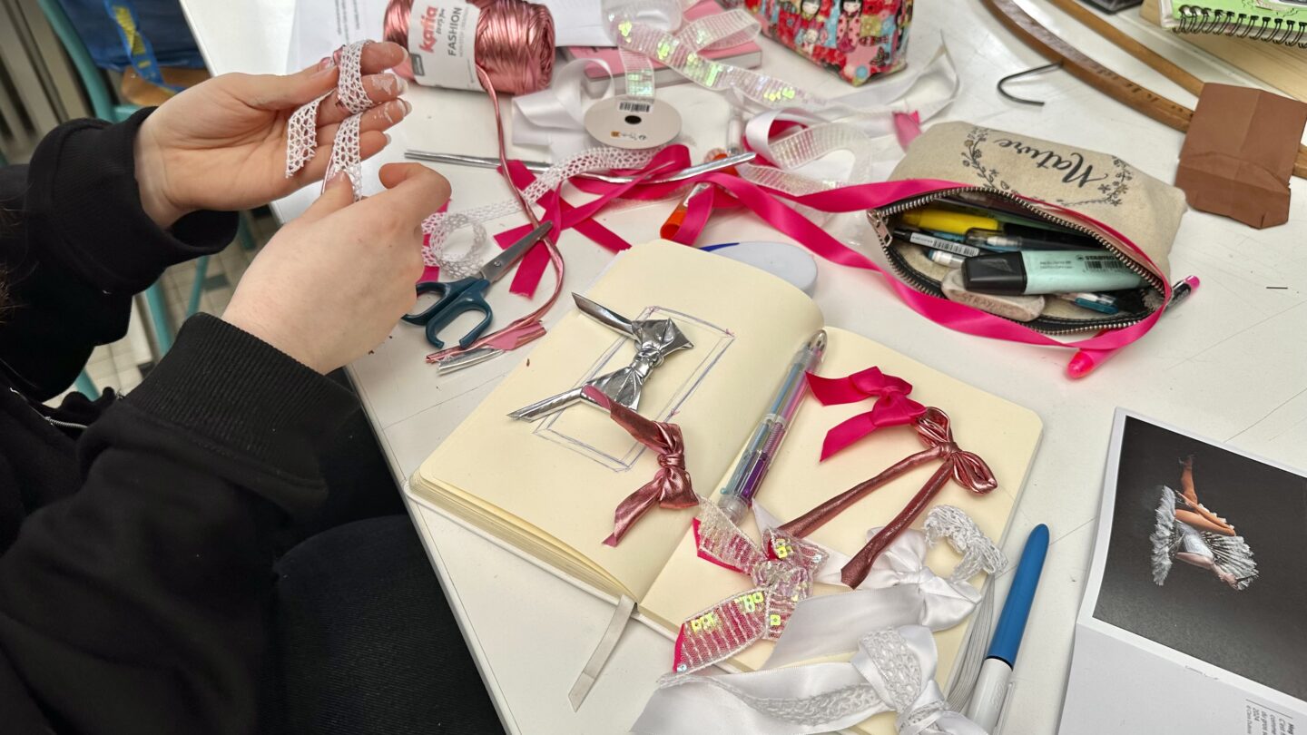 C’est maintenant à eux de créer un objet, un accessoire ou un costume, qui matérialise leurs inspirations. Pour ce faire, chaque élève choisit deux choses qui les inspirent, les obsèdent ou les intéressent (un vêtement, une technique ou encore une musique). Un temps d’échange permettra de souligner le lien qui lie ces deux inspirations entre elles. Les matériaux mis à la disposition des élèves pour leurs réalisations seront tirés de l’univers plastique de Meg Boury : tissus, rubans, dentelles, sequins, plumes…