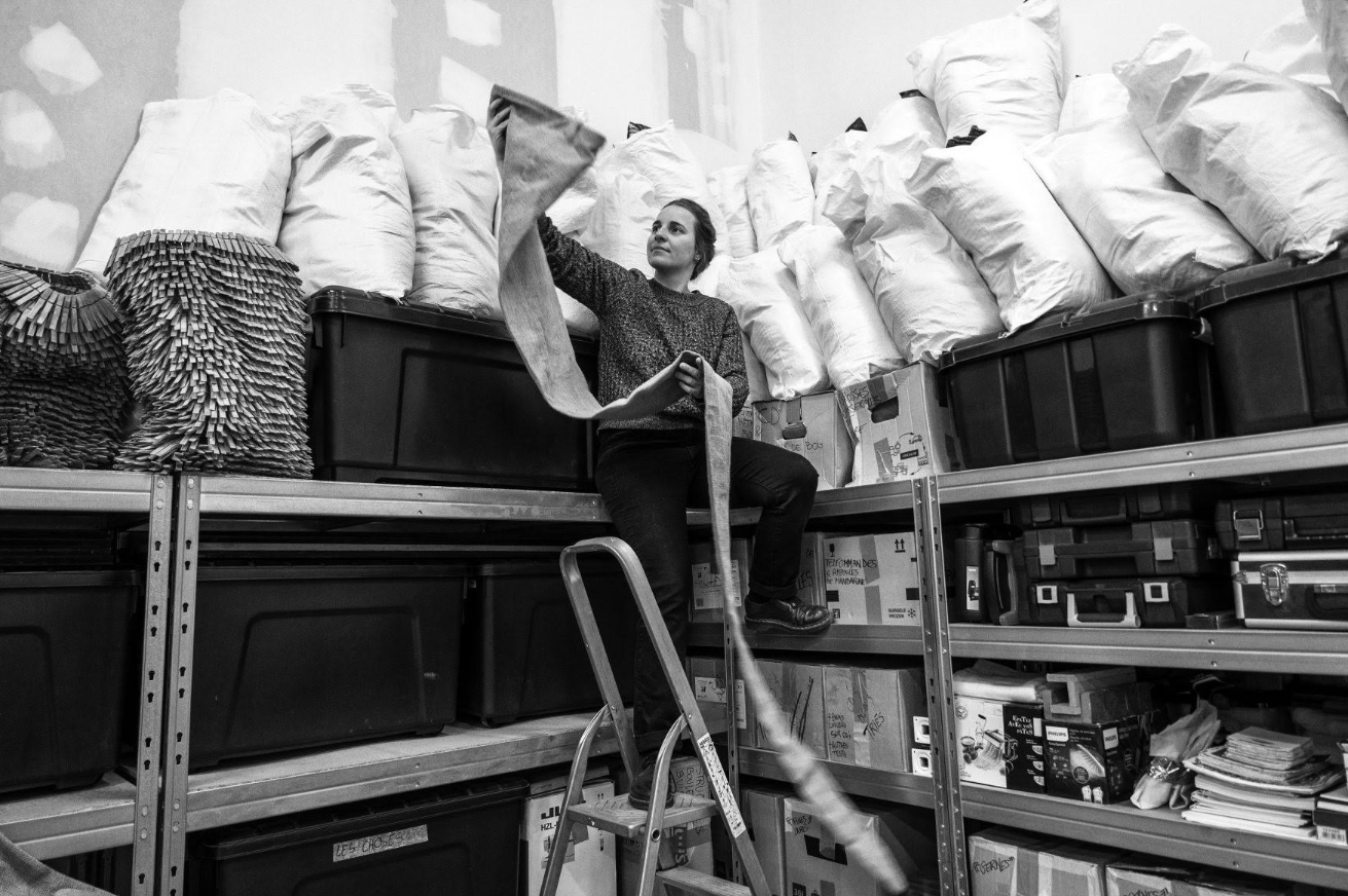 Sans jamais égaler les performances d’une machine, elle interroge les limites de son corps, profondément engagé dans ce travail. Vestiges de ce labeur, les œuvres épousent l’espace et invitent le spectateur à ralentir et à s’immerger dans un univers étrange qui, avec ses différents niveaux de lecture, sème un trouble.