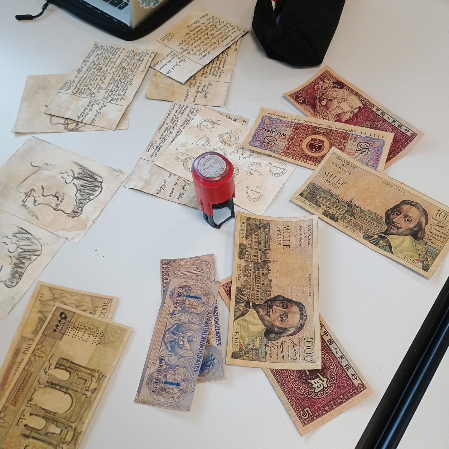 À partir d’une recherche effectuée en amont – matériel de collecte, objets familiaux/affectifs, témoignages – les élèves sont amenés à contextualiser cette matière collectée (entretiens, carnets de terrains, données primaires) par une documentation, associant le matériel de collecte , la description et l’analyse des sources empruntant à l’enquête de terrain ethnographique, afin d’imaginer et de rendre compte de leur provenance réelle ou fictive, de falsifier la mémoire, d’où le titre de l’atelier « Les faussaires« . Ce matériel traduirait la vie et l’histoire intime des populations fictives.