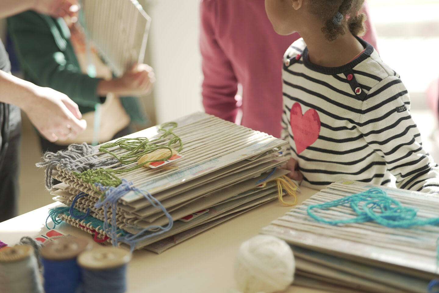 Suite à une visite de l’exposition, qui fût l’occasion d’un première rencontre avec Margaux Pleyber, les élèves participent à des séances de pratique en classe.Fidèle à sa pratique personnelle, Margaux Pleyber propose aux enfants une observation du paysage à travers le cadre de la fenêtre, des temps de dessin, mais aussi une initiation à la pratique du tissage. Dessus, dessous, les morceaux de textile composent minutieusement la trame d’un ciel, des arbres mouvants, des feuillages ou des couleurs extérieures.